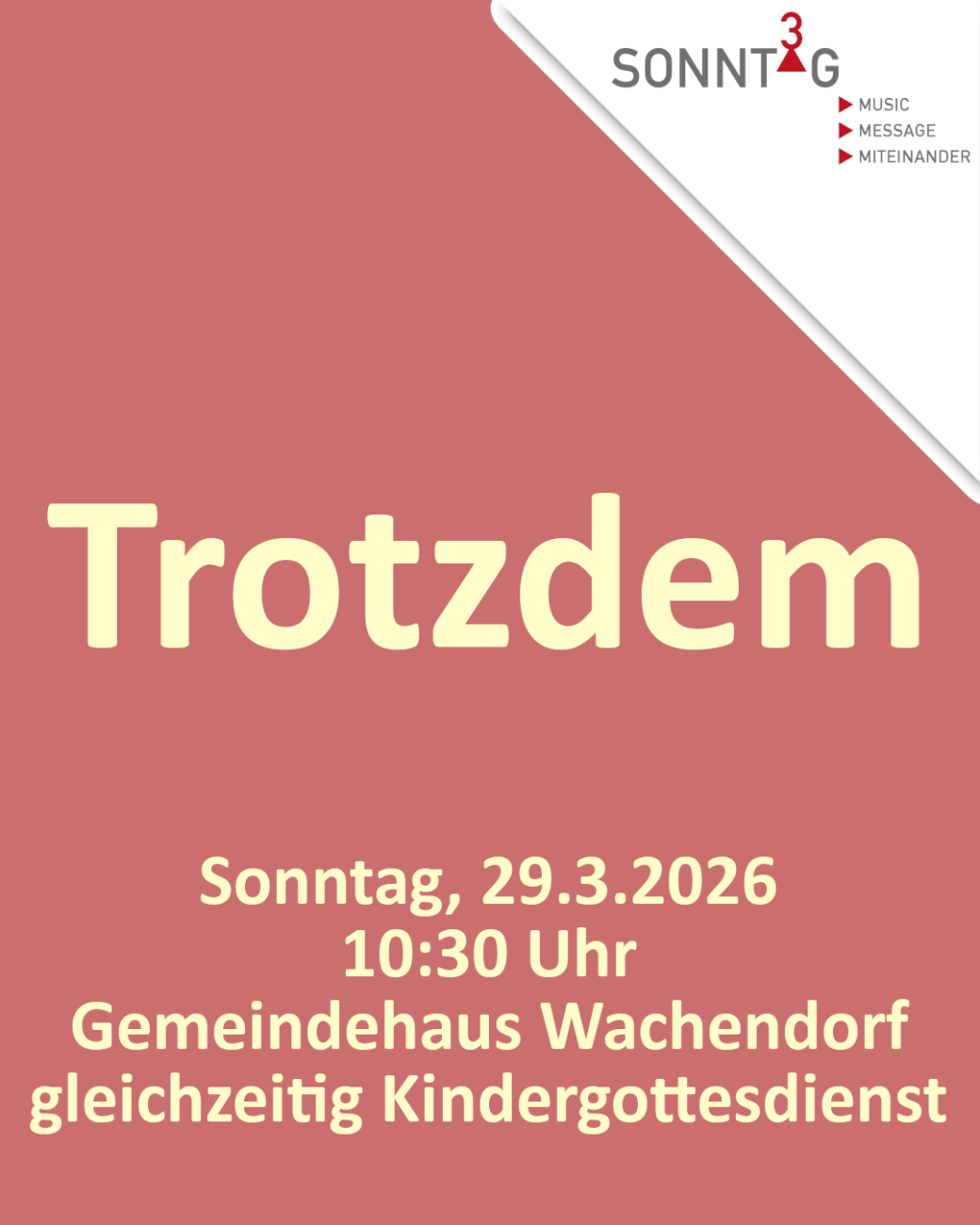 Herzliche Einladung zu unserem SonntagHoch3-Gottesdienst (music - message - miteinander) mit dem Titel "Trotzdem" am Sonntag, 29. März 2026, um 10:30 Uhr im Gemeindehaus Wachendorf!