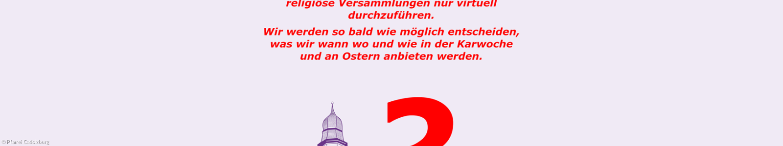 Wir (die Pfarrei Cadolzburg) werden so bald wie möglich entscheiden, was wir wann wo und wie in der Karwoche und an Ostern anbieten werden. Dazu müssen wir aber erst die konkreten Vereinbarungen zwischen Land Bayern und den Kirchen abwarten.